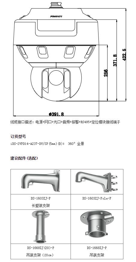 iDS-2VPD14-A237-DV/SP(5mm)(B)星光級全景網絡高清智能球機,采用一體化設計,單産品即可同時提供全景與特寫畫面,兼顧全景與細節。其中全景畫面由8個傳感器拼接而成,可實現360度的全景監控;一體化機芯和高速雲台設計,在全景監控的同時爲用戶提供快速細節定位功能。另外全景球機還集成了先進的視頻分析算法和多目标跟蹤算法程序,可實現自動或手動對全景區域内的多個目标進行區域入侵、越界、進入區域、離開區域行爲的檢測,并可輸出報警信号和聯動雲台跟蹤,從而滿足高等級要求的安保需求。